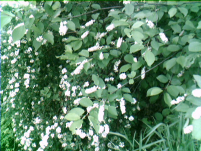 Today, this mystery shrub has been entertaining a varied host of bees and wasps. Some were so small, I could barely see them. Some looked like half-size honeybees with long eyelash-like antennae. The biggest was a middling bumblebee. There was also some sort of red bug, though definitely not a ladybug. All of them were loving these sweet-smelling white racemes, and totally ignoring the spirea right next to it.