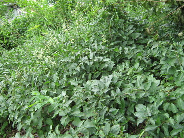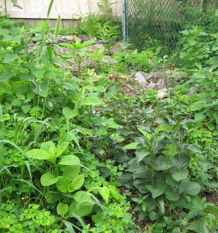 Here’s what the other side of the back yard looks like, where I haven’t managed to weed out anything. Now it’s completely choked by one weed, black swallowwort.