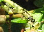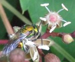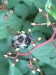 They’re after the pollen, as you can see by the green sweat bee that’s completely covered. I think the little gray bee, the one that’s more in scale with the flowers than the bumblebee, is a leafcutter bee, especially since they’re supposedly fond of Virginia creeper. They’re so small, it’s hard to be sure.