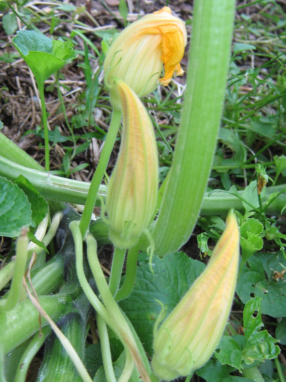 The male blossoms started about a week ago. Most of the early squash blossoms are male. As you can see, lots of them queue up to flower, day after day. The unopened ones still have pointy tips. Their pollen is most effective on the morning of the first day that they flower. Then they close up with sort of a loose knot on top. They only open one more day, and then they drop off. Unless you eat them.