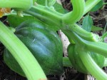 #3 is a compact bushy plant with five fruits on it. The ridges have me hoping for acorn squash, but that’s what I thought the pumpkin was before it got so big.