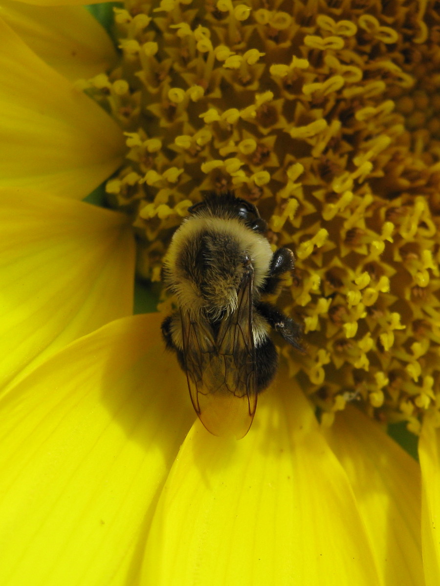 Just like this bumblebee that I found a few weeks ago, curled up on a sunflower on a sunny morning. She seemed a bit groggy as she bestirred herself, took a sip of nectar, and eventually flew away. And lately, I’ve been finding bumblebees bedding down for the night on the goldenrod.