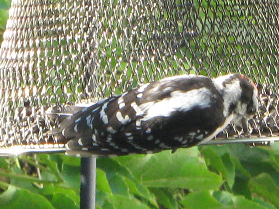 Here’s some pictures I’ve been saving for a rainy day (and yes, it poured today and it’s going to keep pouring, they say). For some reason, I get excited when I see a woodpecker visiting the cat entertainment center bird feeders; I guess it seems more “woodsy” than a sparrow. Based on its size, compared to that chickadee, I think it’s a hairy woodpecker, though it could be a downy woodpecker. Either way, it’s pilose.