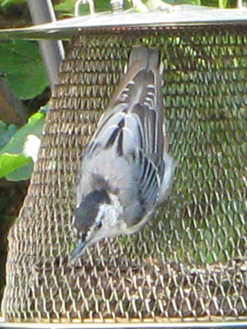 The other bird that always startles me, and cracks me up with the way it feeds upside down, is the White-Breasted Nuthatch. Thing is, I thought both of these birds were insect eaters, not seed eaters. But I do have to confess that I’ve spotted moths in the seed, so it’s possible their grubs are what the birds are after. Ew. That black oil sunflower seed has more variety in it than I thought.