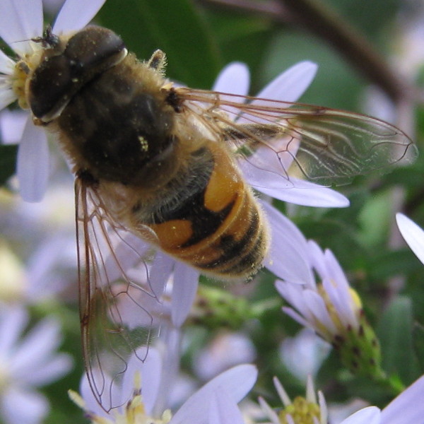 Except one of them is a syrphid fly that is not a bee, but an incredible simulation. It’s amazing how much it looks exactly like a honeybee until you get close enough to see its head. Apparently it’s a bee mimic, Eristalis tenax.