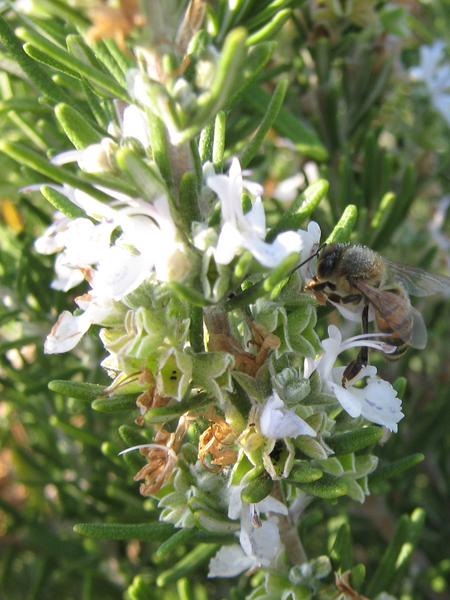 Honeybees, like this one getting dusted with rosemary pollen, love sunny days.