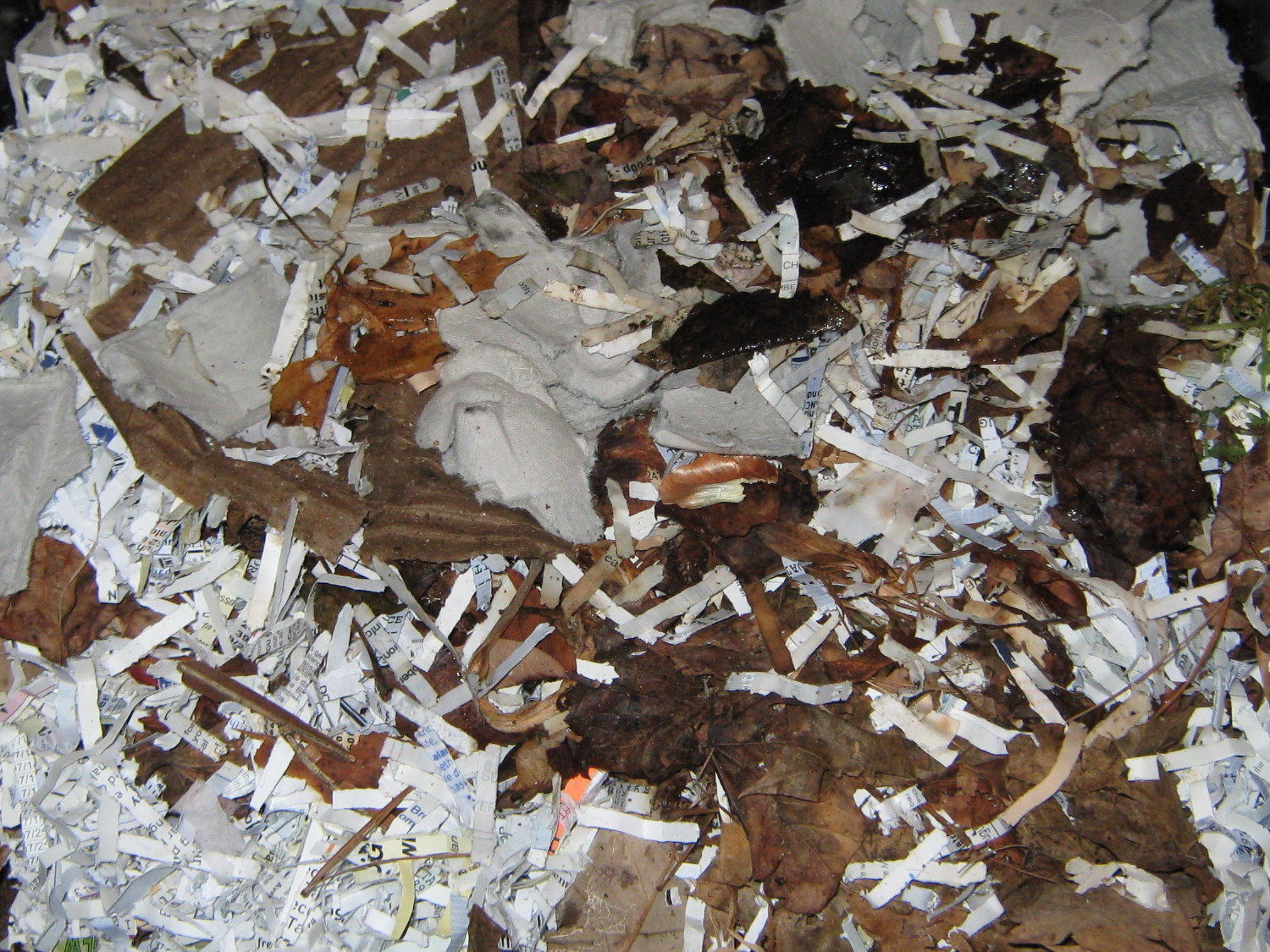 The first two levels look pretty much the same. For the bedding, I use a mix of leaves and shredded paper. This topmost tray is dry, to discourage the fruit flies. I bury the scraps in the second tray, and keep it covered with bedding. As the moisture in the scraps wets the bedding, it becomes damp enough for the worms to come up.