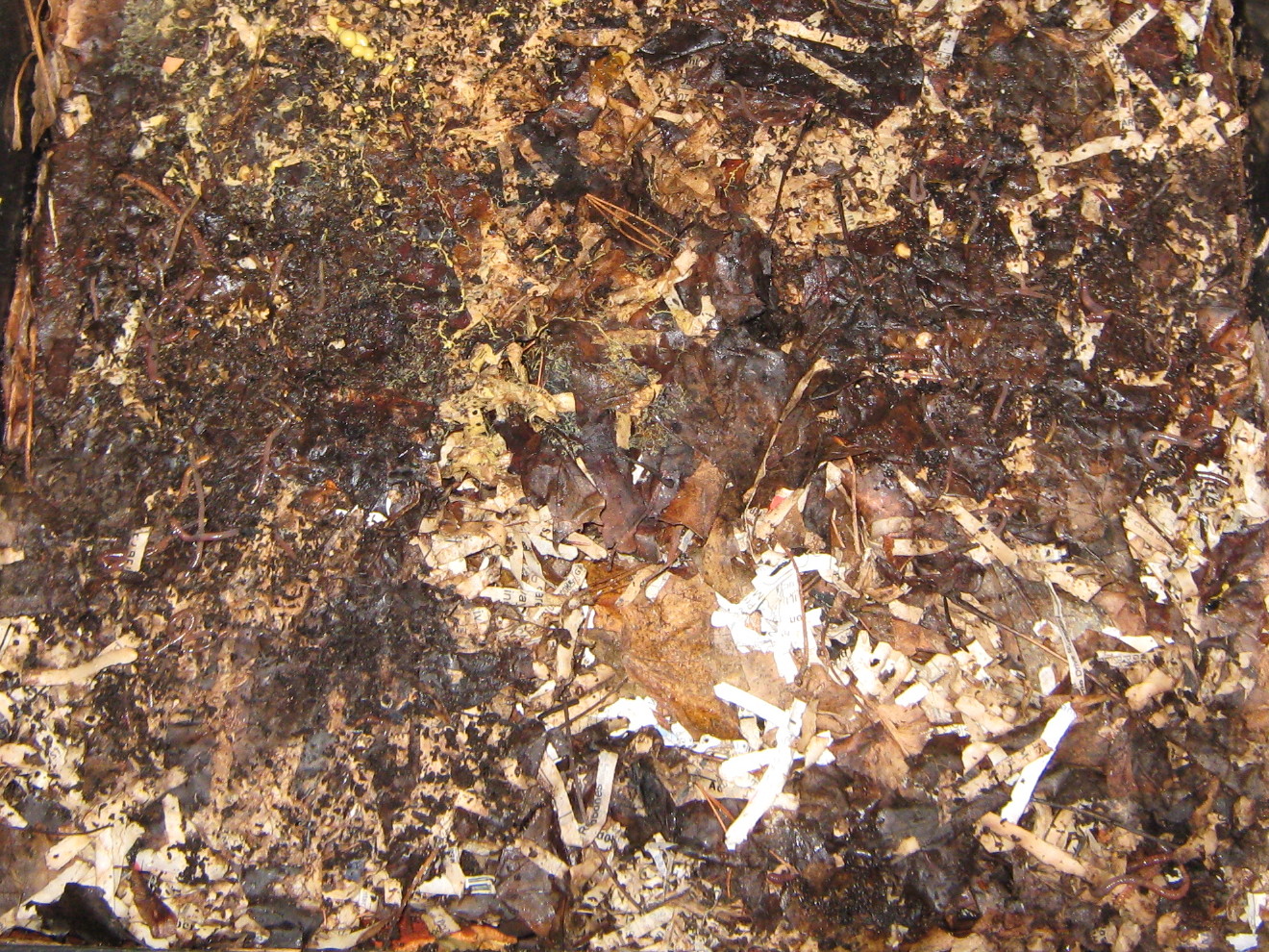 The middle tray is where you start to see some worms on the surface. The main evidence of their presence is the darkening of the bedding with worm castings. From here down, things get moister and earthier. In fact, the drain at the bottom is dripping excess moisture (worm “tea”), which is how I know the stack is moist enough to cycle.