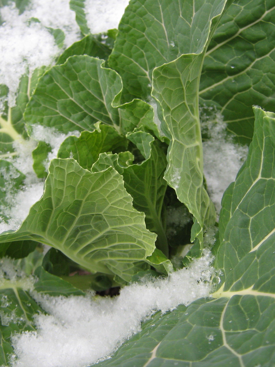 The first bit of snow started drifting down last night, leaving just a light frosting, not even enough to hold a cat’s pawprint. I think there’s more snow gathered in these collard leaves than ever hit the ground. By the way, these are the same plants that were looking so droopy last week. Tough plants, tough leaves, but so tasty.