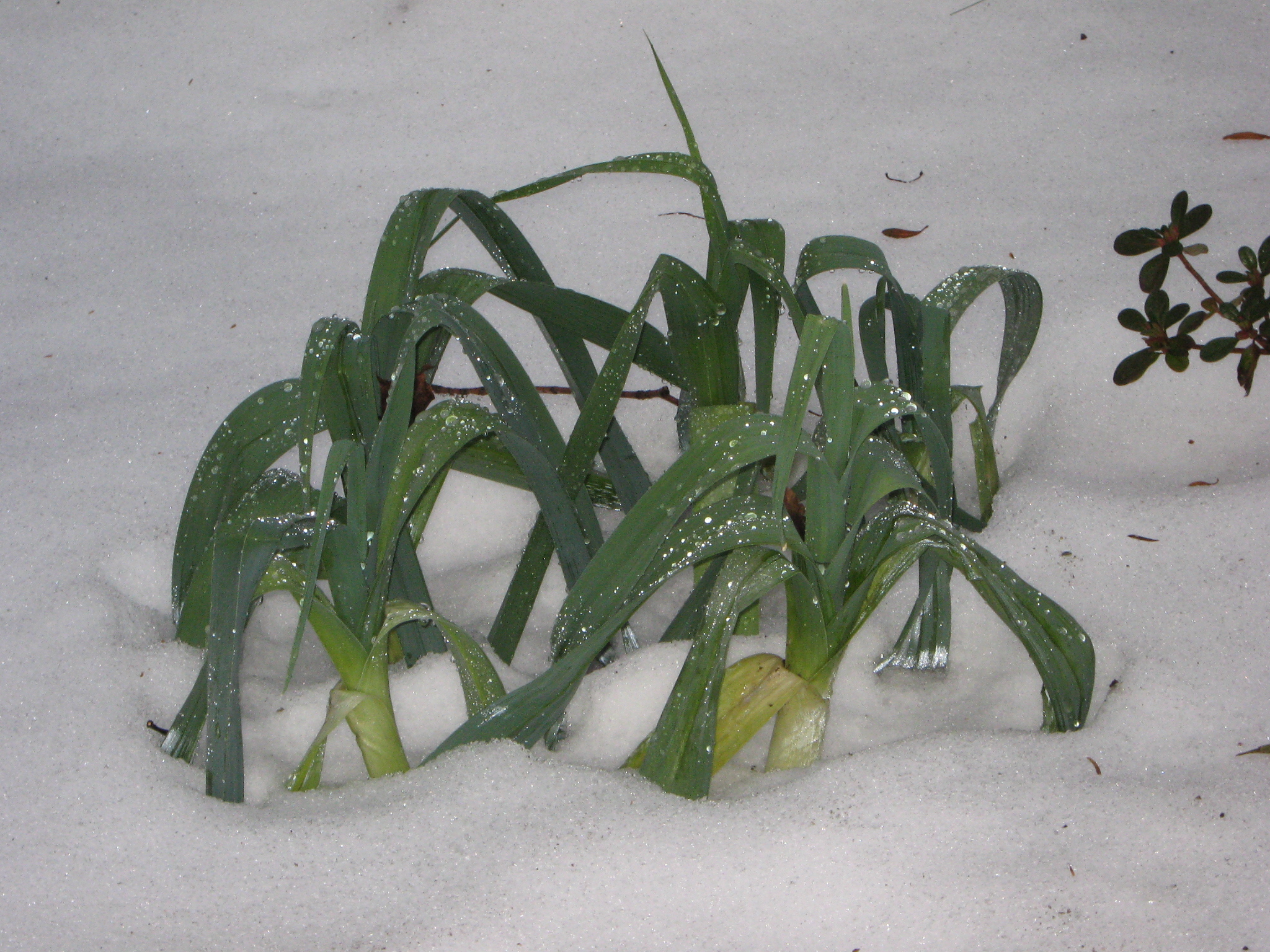 When the rain came, it washed off a little more snow, and covered the leeks with spangles of droplets.
