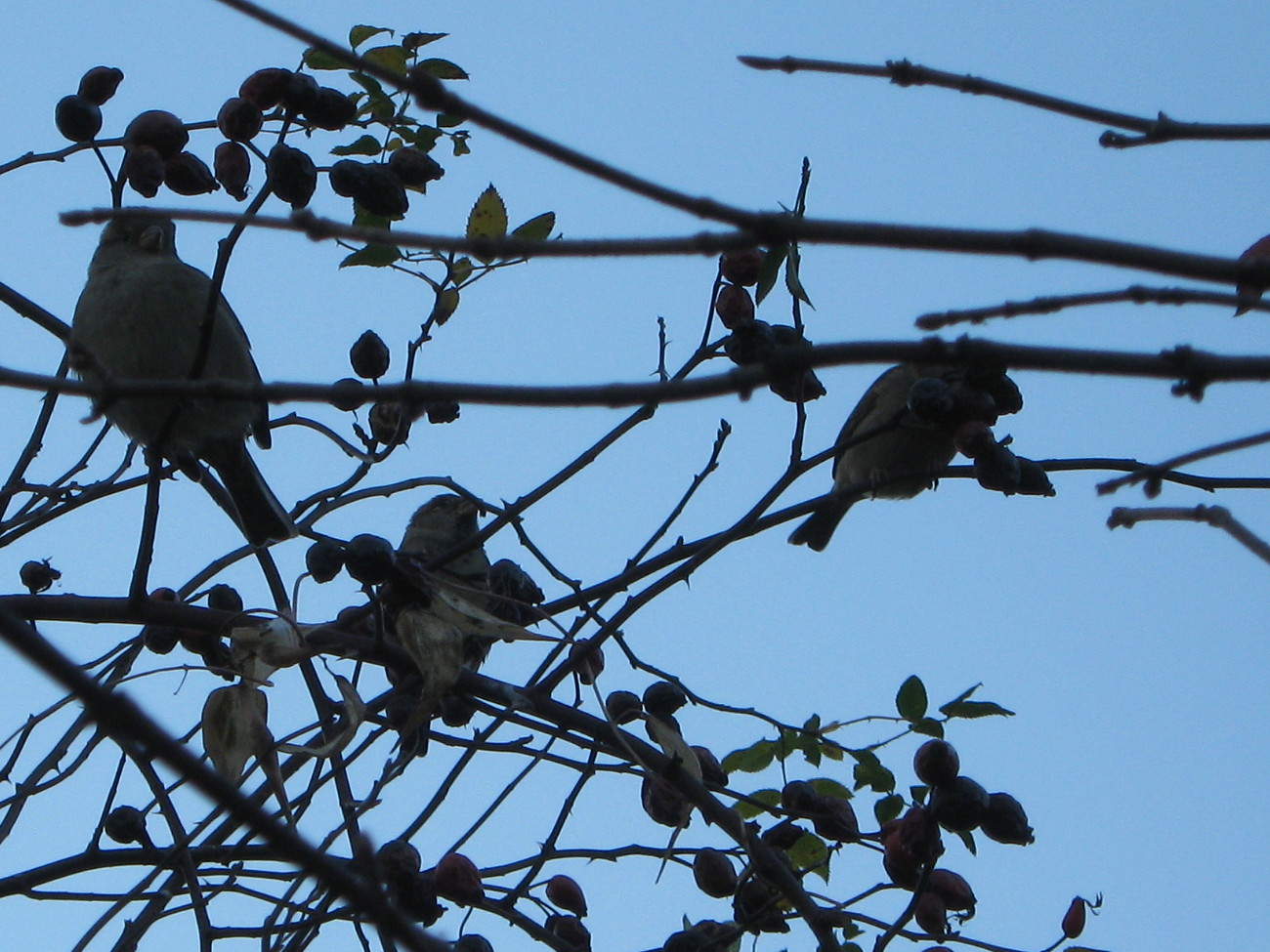 Often there are so many birds — sparrows, mostly — in the bushes that the rustling of their flitting about sounds like a much larger animal rattling about in there. It can sound downright alarming if you don’t see them. Then I look up through the branches of my little viburnum, and there they are in the wild rose bush. All those rose hips, but do the sparrows eat them? Noooo. They’re waiting on me to fill the bird feeders. And so is the woodpecker. And the cardinals. And the chickadees. And don’t forget the squirrels.