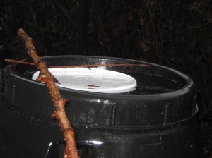How do you like my elaborate, highly asthetic bird bath? It’s a frisbee on a compost tumbler, with a couple sticks thrown in for the birds to get a grip on. Until yesterday, it was a clay saucer, but I broke it trying to wedge it out of the ice. That’s because my high-tech solution for keeping the ice away is a trip out back with a teakettle full of hot water.