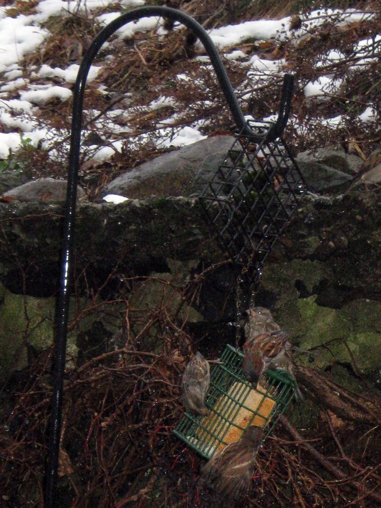 Today, though, the birds are ignoring the water. The rain might have something to do with that. Instead, lots of wet sparrows are mobbing the suet feeder.