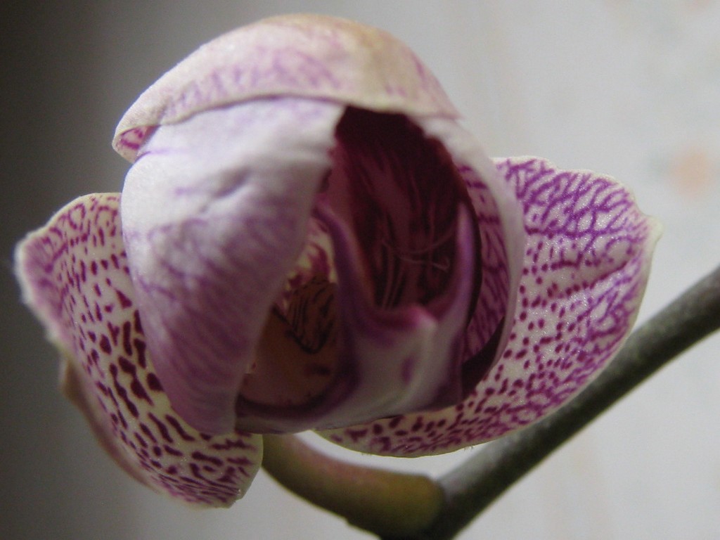 Bit by bit, the orchid inches open. One, then two wings of petals unfold, drawing aside the edges of the veil cast over the insides.
