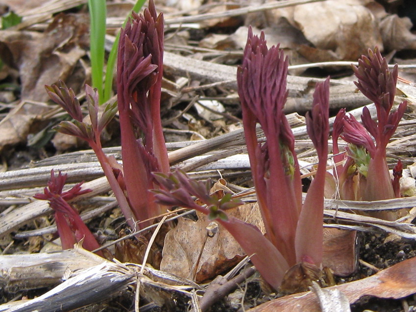 It’s pouring again. Again. So I’m ignoring the rain again and showing more plants sprouting. These are Dicentra, probably the Bleeding Hearts. Not quite as charming as trains of little pink hearts, but I like the deep red color and the tiny folded fans of the leaves.