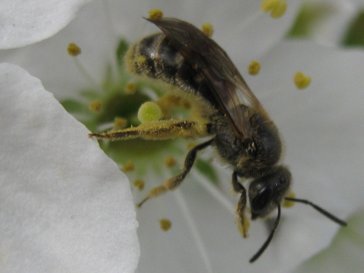 The plum tree is now covered in fluffy white blossoms, and surrounded by little bees zooming in and out. They don’t stop for long, quickly moving on to the next prospect. This one is a sweat bee of genus Lasioglossum, which I suppose doesn’t tell you (or me) much. They are native bees and this one probably came from a nest in the ground, and she’s probably foraging for nectar to provision the nest she’s building. Probably best of all, she’s pollinating plums.