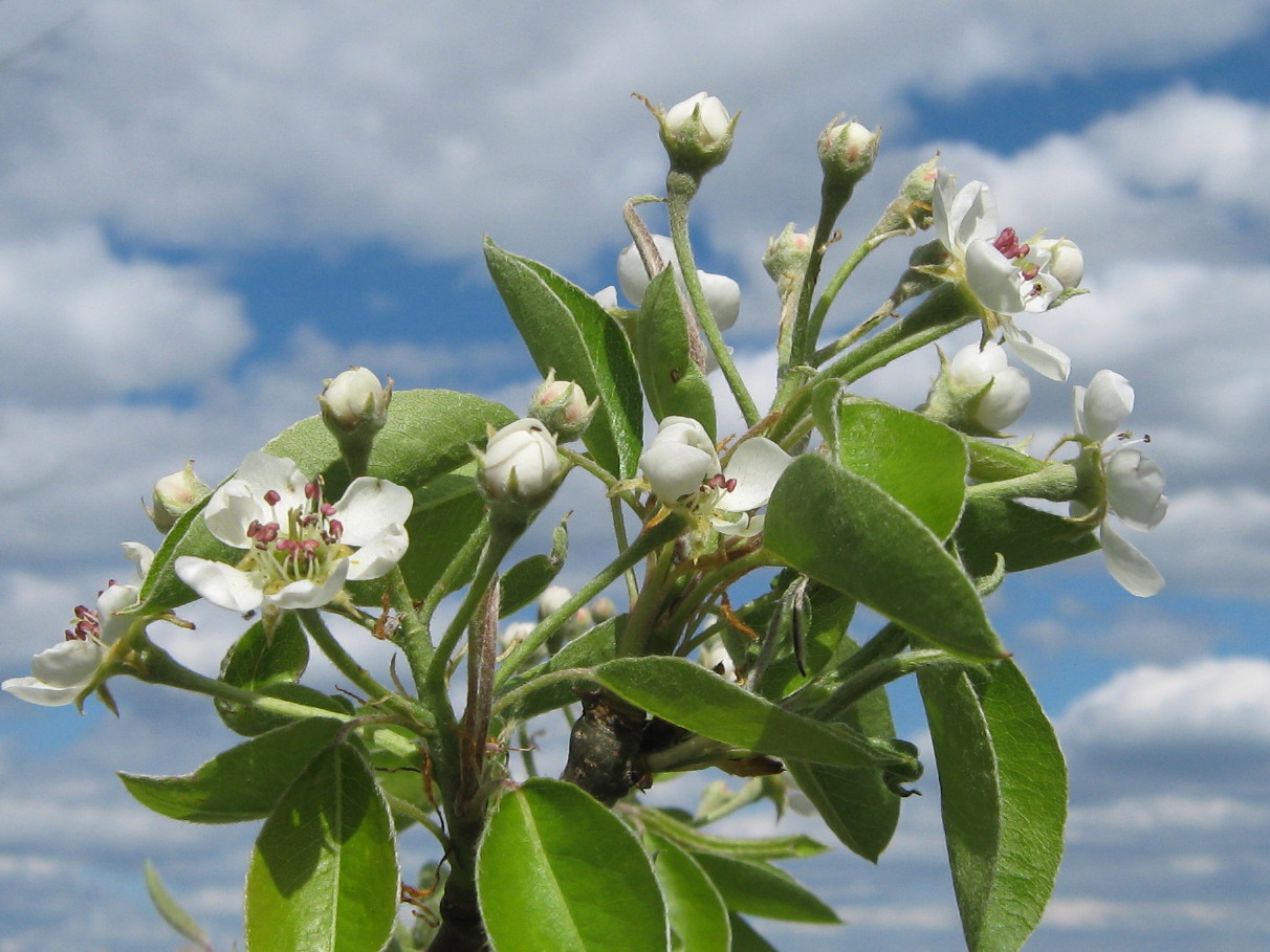 The pear trees are in flower, too ,though not as extragantly as the plum tree. I like how they hold up white clusters to the sky. That means all my fruit trees are in flower.