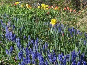 The bulbs are massing into sweeps of color. From this angle, it looks like the blue grape hyacinth are planning to go after the tulips. And that daffodil might get caught in the middle. But standing there what I really noticed was the sweet, soapy scent of lots and lots of flowers.