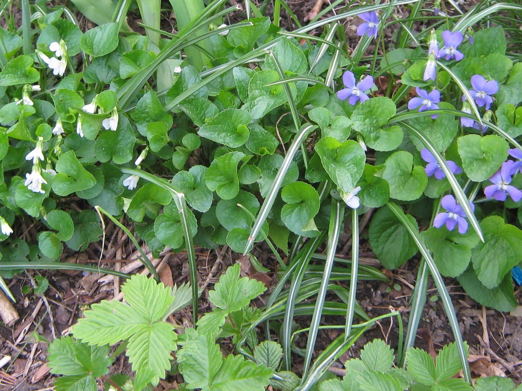Not all uninvited plants are weeds in my yard; some are welcome guests. The violets that pop up on every patch of cool bare earth make a lovely groundcover. They flower well into summer. They only grow a few inches tall. (No way do I ever mow.) And if I want to claim the space for something else, they’re easy to pull up. And very, very occasionally I spot a tiny bee visiting them.