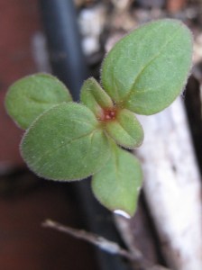 Some of that potential is sprouting now. These are flowers that reseed reliably if you leave the ground undisturbed at the right time. That’s sweet alyssum on the left. In time it will form a dense mat of sweetly fragrant little white flowers. When it first appears, you see tiny narrow leaves. And I’m pretty sure that’s snapdragon on the right. The leaves are very round, and they have a tinge of red.