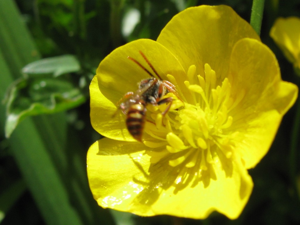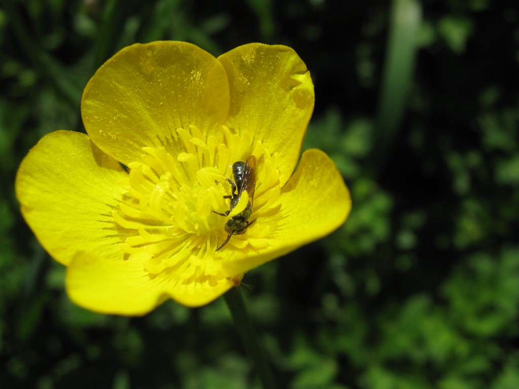 It’s not native here, but I like the way it looks. The way it spreads is handy for allowing bare patches to cover themselves. The way it spreads isn’t so great when it sends creeping stems and roots among other plants, but it’s not so hard to find the crowns and root them out. And if you’re looking close enough to examine the leaves, you’ll see the real reason I like the buttercups (and here comes a big surprise): bees.