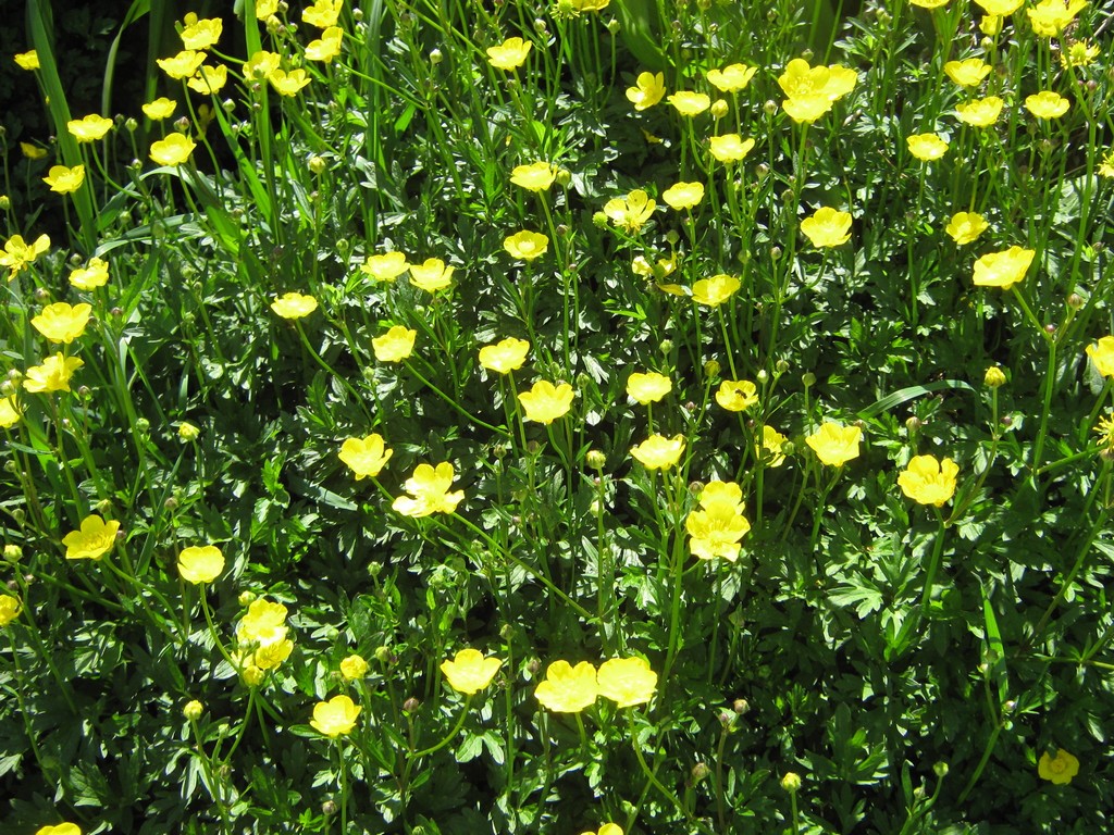 As spring warms up, the buttercups open, in dense patches of bright yellow flowers. The flowers have bright, glossy petals that can look almost white. Even when they’re not flowering, their leaves have an interesting mottley spottleness. That’s how you know these particular buttercups are Ranunculus repens.