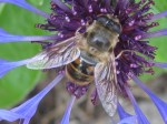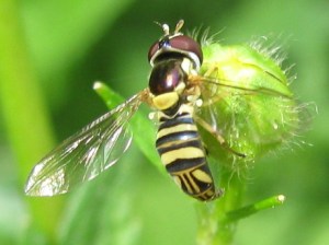 Sometimes you hear them first, sounding like a bee buzz, only louder and more whiny. These often look like bees too, bee-sized, and bee-patterned, like the Drone Fly (I think) on the left.