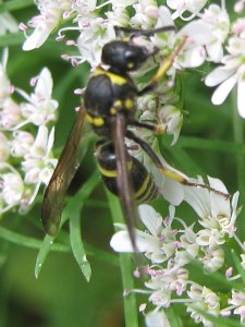 This particular wasp appears to be a potter wasp. It’s a predator that builds little jug-shaped mudpots filled with catepillars for the larvae to eat. Wonder where the mudpots are?