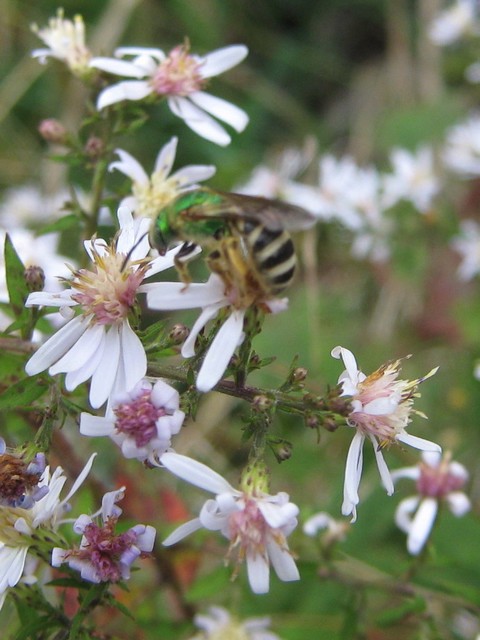 If I had to pick a favorite wildflower, I think of fall and pick wild asters (with goldenrod a close second). The asters flower late, when the other flowers are faded, in waves of pastels ranging from pink and violet to white. They bring all sorts of bees, honeybees and bumbles, bees big and small, including my favorite little bee, the shiny green Agapostemon.