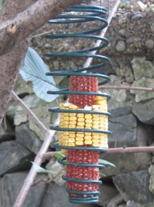 The latest addition to the critter feeders is a hanger to put dried corncobs in. This is my most successful attempt so far to get the squirrels to leave the birds more sunflower seeds. In the mornings, I often see squirrels having a leisurely breakfast, but after I fill the bird feeders, they still go for the sunflower seeds. So I wasn’t sure that the squirrels really liked the corn all that much.