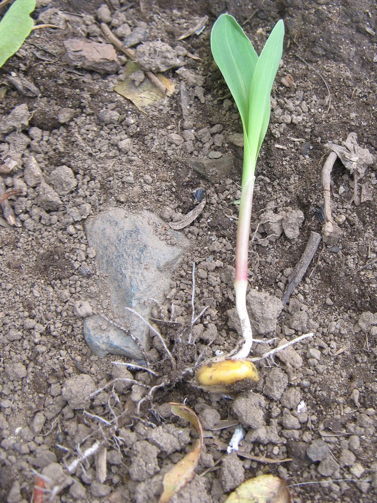 Maybe there’s a reason why those sprouts look familiar. Maybe there’s reason why they’re scattered on the slope above the feeder and on the ground below. Maybe I should pull one up.