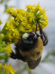 We went out for dim sum today, and I feel as lazy as a bee hanging on the goldenrod with a faceful of flower. This is a Carpenter bee, and you know it’s a male because of the light spot on his face. He was so sleepy, I could move the goldenrod to an easier reach and put the camera right in his face. And yes, bees sleep.