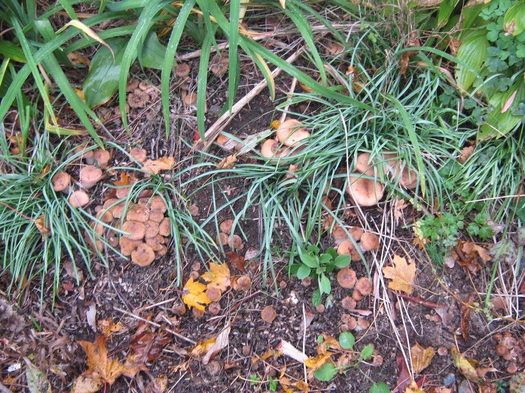 All over a corner of the hill, a swath of mushrooms has popped up like, like, mushrooms. This is just one small portion of them. And the visible portion of a fungus, the fruiting body, is just one small portion of the whole organism. There must be a giant mass of mycelium under there.