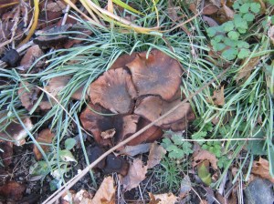 Where the mushrooms are growing, now it’s mushrooms upon mushrooms upon mushrooms up there. Since a sea of brown is not a lovely picture, here’s one of the peripheral clumps, so you can see what they look like. I would compare them to tree ears, except those actually grow on trees. I would ignore them and let them die away, but there’s so much now I wonder what they could be.