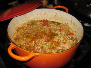 When the chicken is done, pour the rice into the fat in the frying pan and stir to coat. (Yes, chicken fat is a good thing.) Add to orange pot.
