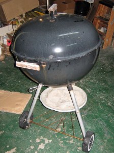 Turned out to be a two-person job. While I was holding the door open for my Faithful Assistant, a leg fell off. From the Weber. I stuffed the leg back into its socket, he wrestled the grill through the door, and the leg fell off again. I reseated it. We hauled the kettle to a good spot — and two legs fell off. Reseat. Reseat. Lift please. Okay that’s good. We’re done.