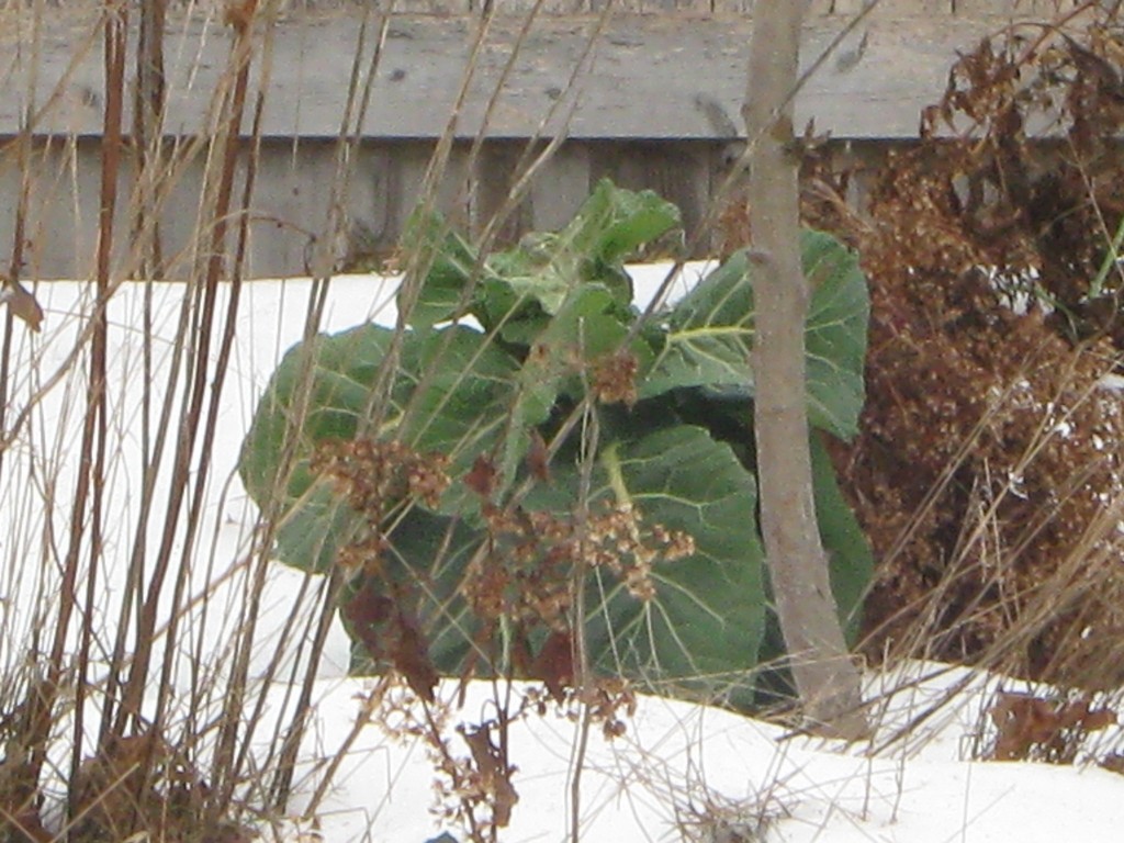 At least one collard plant is still alive. In fact, it’s looking downright chipper after a few days under a blanket of snow.
