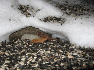 So that’s what the evil cat has been staring into — an ice cave just the right size for a mouse. There’s even a couple of leaves to curl up on and stay dry and a carpet of sunflower seed shells. Must have been quite a feast in there. But where’s the mouse? And how the cat get so fat?