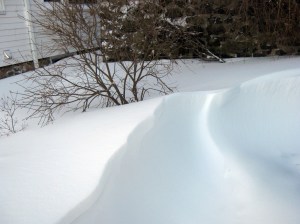 The storm has blown by overnight, and here is one of the snow banks it formed. I love the shapse the snow can form, sweeping crests and overhanging waves. It amazes me how firmly those shapes stay put. And I love it even more when those snow banks form in the right places.