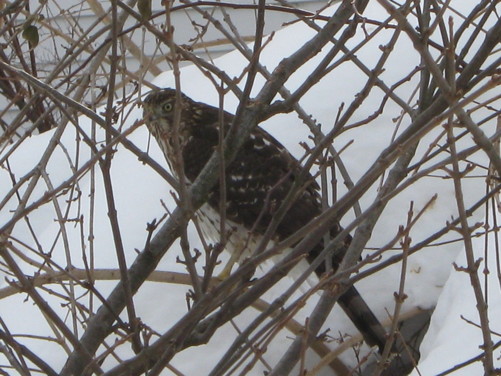 Posted on January 28, 2011January 28, 2011 by Pam Phillips A hawk invading the sparrows' bush …is awesome! A squirrel actually dared to scold this hawk and chased it (her? it’s huge!) out of the bush. The little birds have been very quiet today. Share this: Click to email a link to a friend (Opens in new window) Email Click to share on Facebook (Opens in new window) Facebook Click to share on X (Opens in new window) X More Click to print (Opens in new window) Print Click to share on Reddit (Opens in new window) Reddit Click to share on LinkedIn (Opens in new window) LinkedIn Like Loading... Related