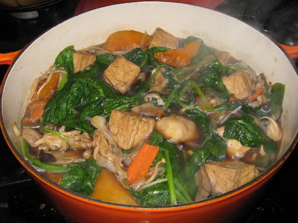 It’s still cold and I’m sti’ll making hot pots. For this one, I threw it a whole lot of things I like in hot pots. It started with kombu and cabbage. Then I scattered in buttercup squash and carrot and taro root. Finally I piled on the mushrooms: shiitake and oyster mushrooms and enokitake and shimeji. The broth was mostly the soaking liquid from the shiitake. I almost forgot to add the tofu cubes, and even after cooking for 20 minutes, the spinach barely fit. After savoring a bowlful over fresh noodles, you know what?