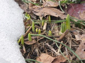 Posted on February 17, 2011February 17, 2011 by Pam Phillips Little green shoots! The snow recedes and reveals shoots. Little green shoots that might be crocus or snowdrops or maybe even daffodils. Things are pretty intermingled in there. Could be all three. Or could be I’m getting my hopes up. Share this: Click to email a link to a friend (Opens in new window) Email Click to share on Facebook (Opens in new window) Facebook Click to share on X (Opens in new window) X More Click to print (Opens in new window) Print Click to share on Reddit (Opens in new window) Reddit Click to share on LinkedIn (Opens in new window) LinkedIn Like Loading... Related