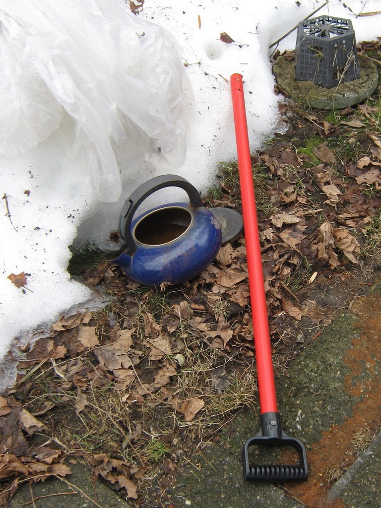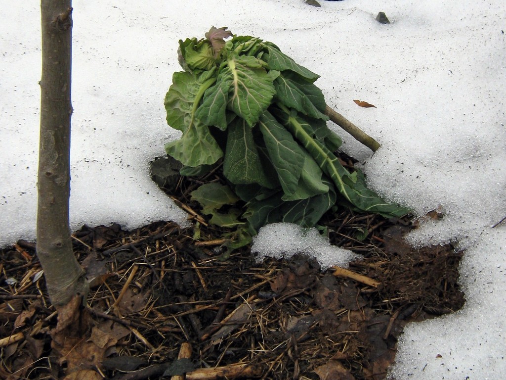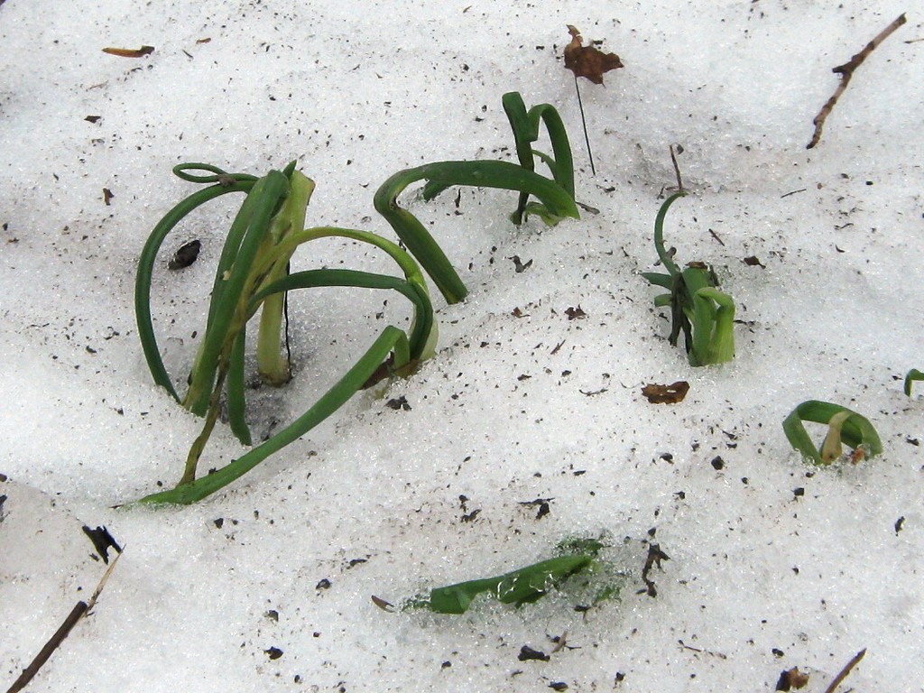 The melt indicator is down. The snow that held it up is gone. Plants that were completely buried in snow and ice for two months are popping up. How can plants that were so buried still be so green? Look at them!
