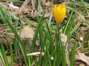 Here it is, the first crocus of the year. As always a sturdy little yellow one. And I saw other signs of spring today. I went for a walk and saw lots of robins milling about amid the starlings. I went for a drive and saw lots of hawks circling the sky and brooding in trees. The sparrows went somewhere where they seem to be finding lots of other food that is not in the nearly untouched feeders. The equinox is just a couple weeks away.