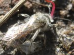 And sure enough, I found a miner bee of genus Andrena on the ground. (That bit of red is a plant shoot, not part of the bee.)