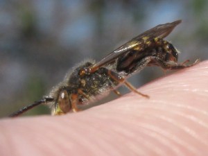One of the bees on the bush lit on my hand and when I got a close look at the photos, I recognized the cuckoo bee of genus Nomada. These are bees that exploit nests built by other bees, such as miner bees of genus Andrena. Hmm. Where there are parasites, there must be hosts not far away.