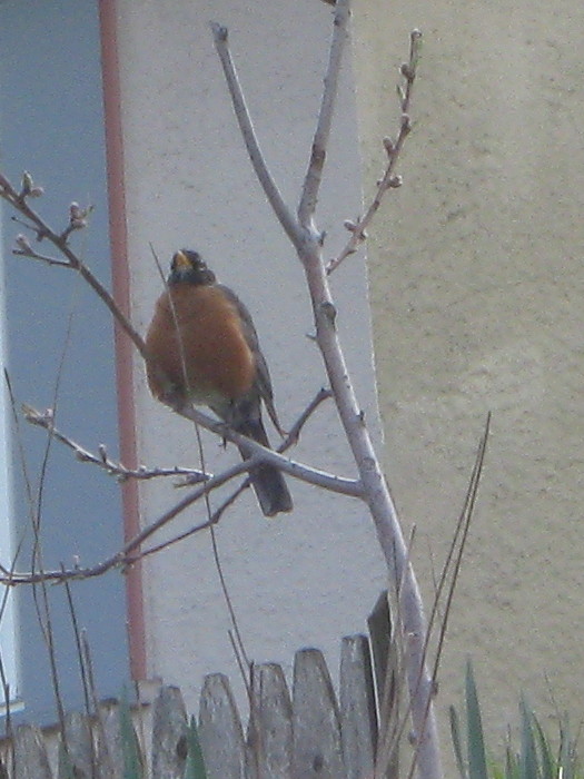 The robins I’m not so sure about. They’re good looking, but they’re feasting on the earthworms in the compost I just spread. Look how fat this one is! I think he weighs more than the peach tree he’s sitting in.