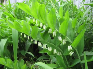 We just hit the beginning of a week of rain and cloudy days. On days like that, white flowers are especially nice. The towers of ajuga glimmer and beckon when I look outside. When I climb up the hill to do a little weeding, these arches of Solomon’s Seal light up under the leaves. And maybe after I do a lot of weeding, I can uncover the blueberry flowers.