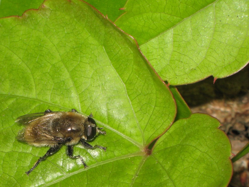 I think these are Narcissus bulb fly. Most of the syrphid flies I see are pollinators and predators, but these guys are total freeloaders. They hatch from the daffodil bulbs and do their little bit of fly business before laying eggs again. No wonder I see a few more every year.