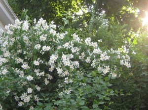 The mock orange is picking up where the peonies left off. Such a nice plant, covered with four-petalled white flowers and smelling sweet on sunny days. (Or at least in the few hours of sun between thunderstorms.) The poor thing was so smothered by that ugly pile of forsythia, when I first noticed it, there was just one branch struggling for air. I wasn’t even sure about what it was until last year. So I waded in and hacked away some room.